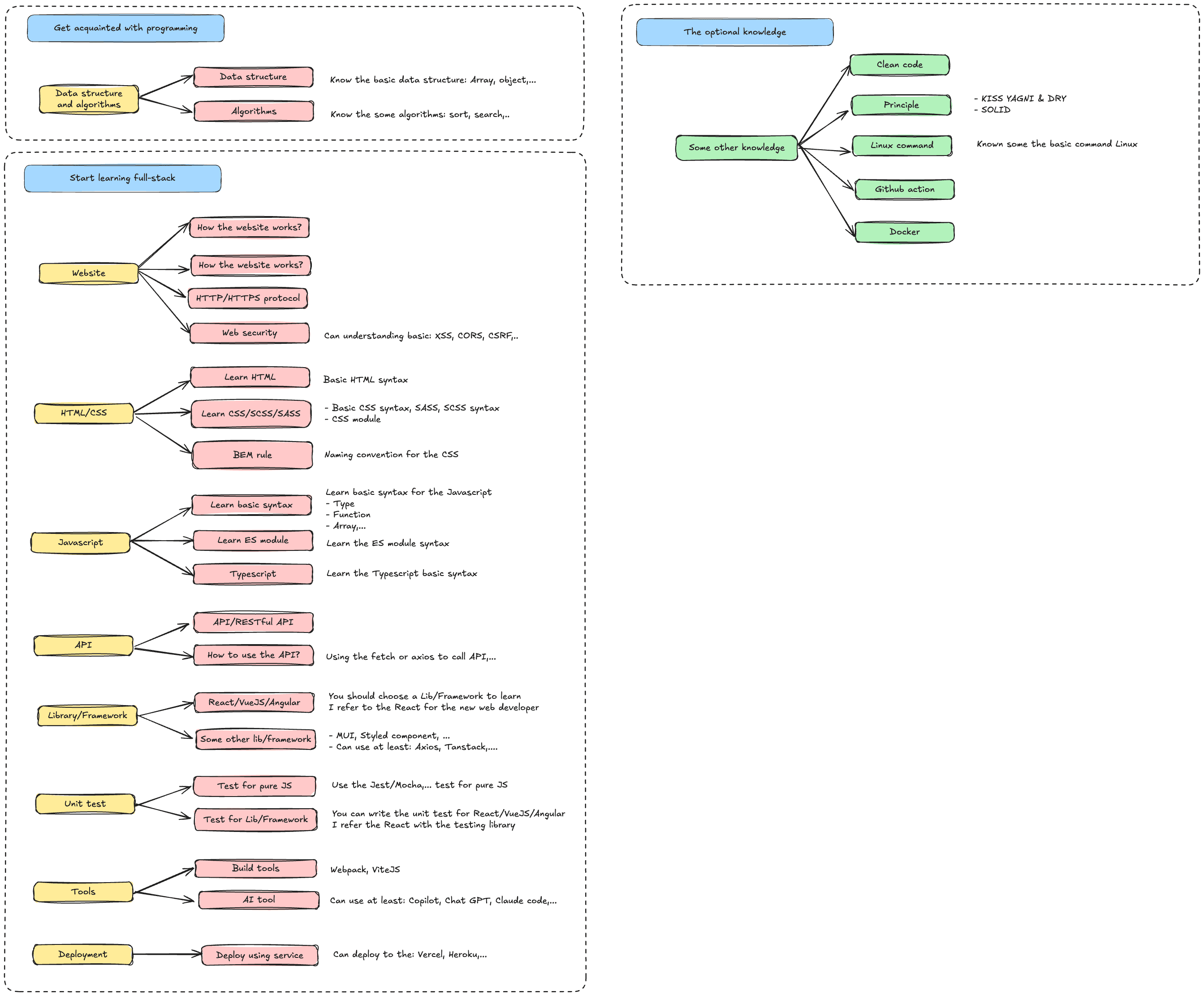 Ở đây mình cũng khuyến khích các bạn cũng nên học như vậy. Mình có một số gợi ý về kiến thức ở phần này giành cho các bạn. Những kiến thức dưới đây là mình đã lượt bỏ bớt chỉ để lại những kiến thức bắt buộc và nền tảng cho phần frontend.